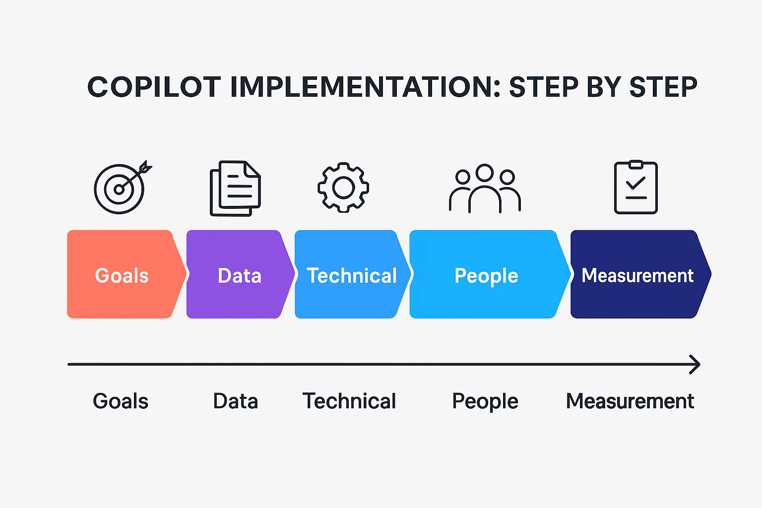 Implementing Copilot successfully requires more than turning on a feature. It is a step-by-step journey that combines strategy, data readiness, technical configuration, and people adoption. The organisations that prepare carefully unlock faster decision-making, happier employees, and measurable productivity gains.