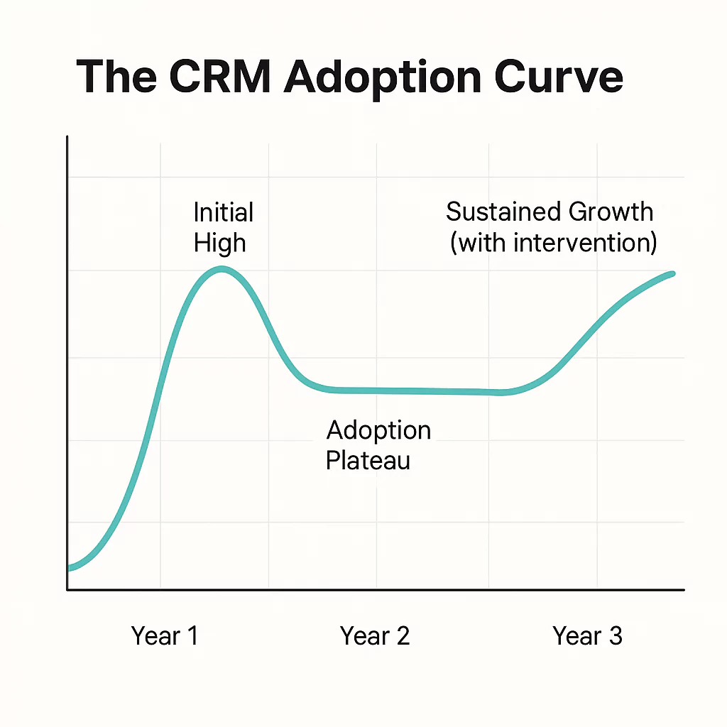 This initial success is supported by vendors showcasing case studies and highlighting feature sets. At this stage, enthusiasm can mask deeper challenges. What looks like genuine adoption may, in reality, be short-term compliance, with users following instructions but not fully integrating the CRM into their daily habits.